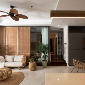 整個扇身採用經典的古銅色與傳統胡桃葉色相結合 、營造出典型的越南建築整體色調 、輕鬆進入多種不同空間的設計。